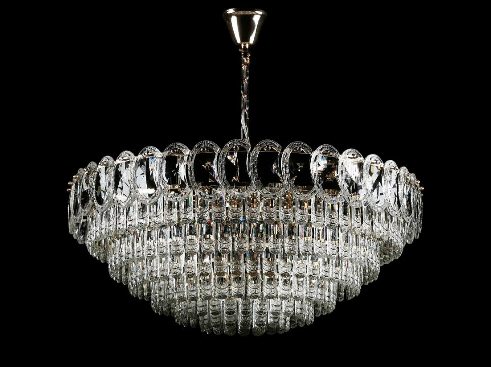 Корпус із міцного металу з покриттям під золото ідеально поєднується з прозорим кришталем, що відбиває світло в десятках граней. Люстра обладнана 14 лампами E14, що забезпечує потужний потік світла та рівномірне освітлення великих приміщень — залів, віталень, банкетних кімнат.